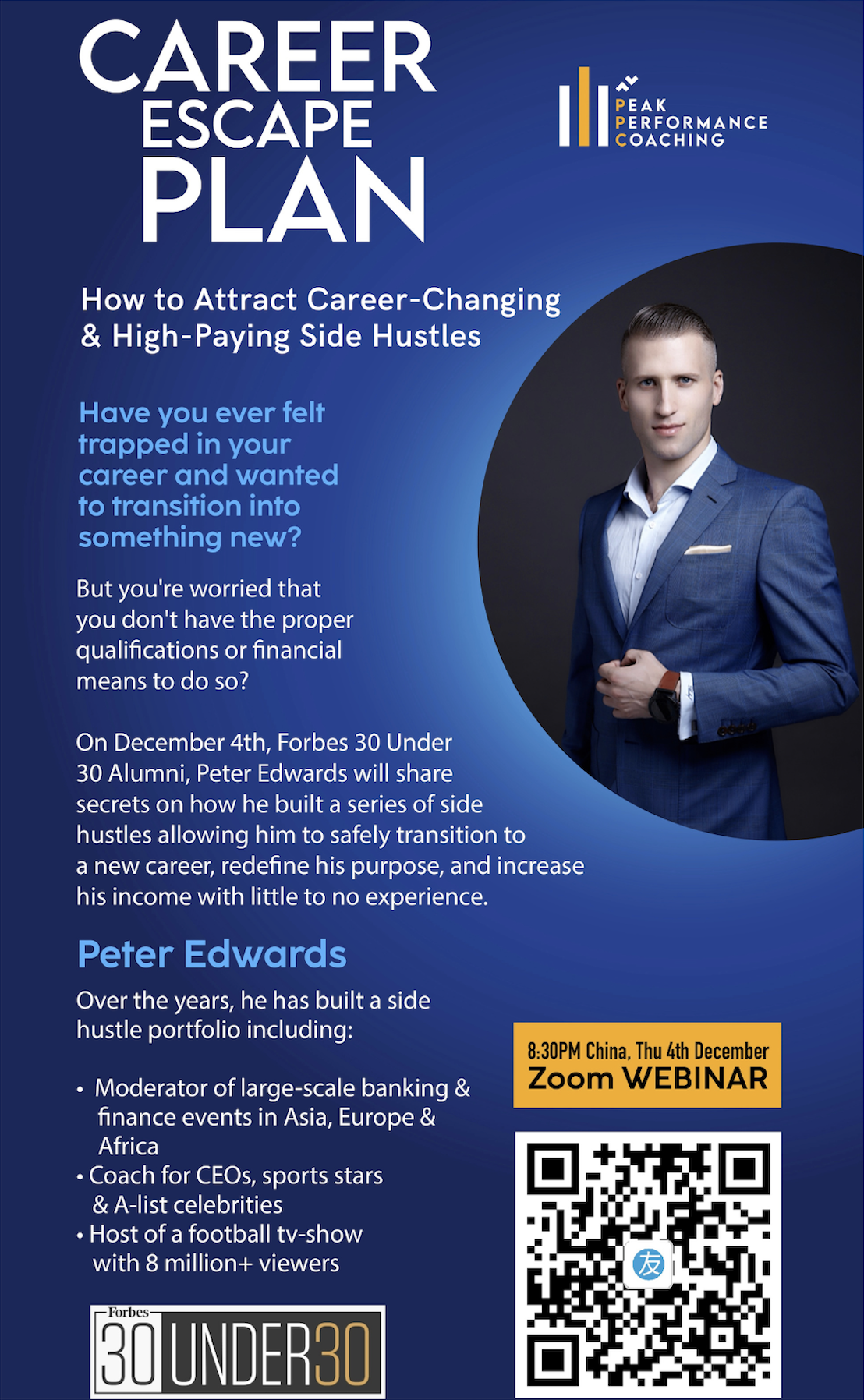 Have you ever felt trapped in your career and wanted to transition into something new? On Thursday, December 4th, Forbes 30 Under 30 Alumni, Peter Edwards, will share secrets on how he built a series of side hustles allowing him to safely transition to a new career, redefine his purpose, and increase his income with little to no experience. Peter is a coach for CEOs and sports stars, and a host of a football TV-show with 8 million+ viewers. The time is 8:30 PM China Time. (The contact QR code includes a WeChat logo.)
