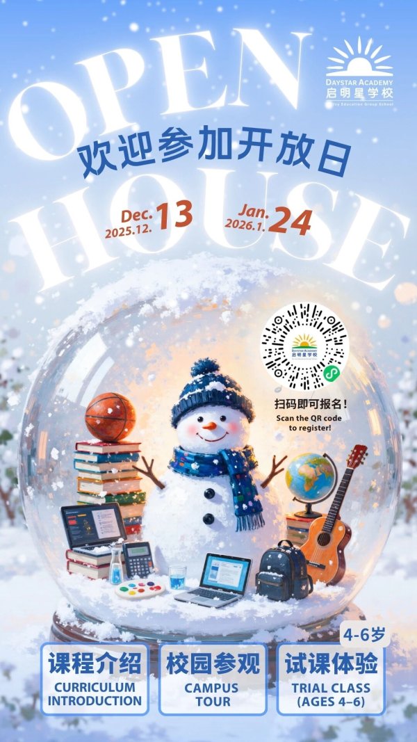 Daystar Academy welcomes parents to their Open House to explore their curriculum, tour the campus, and attend a trial class for children aged 4-6. This is a great opportunity to learn about the school's educational approach. Scan the QR code to register! (欢迎参加开放日 - Daystar Academy)