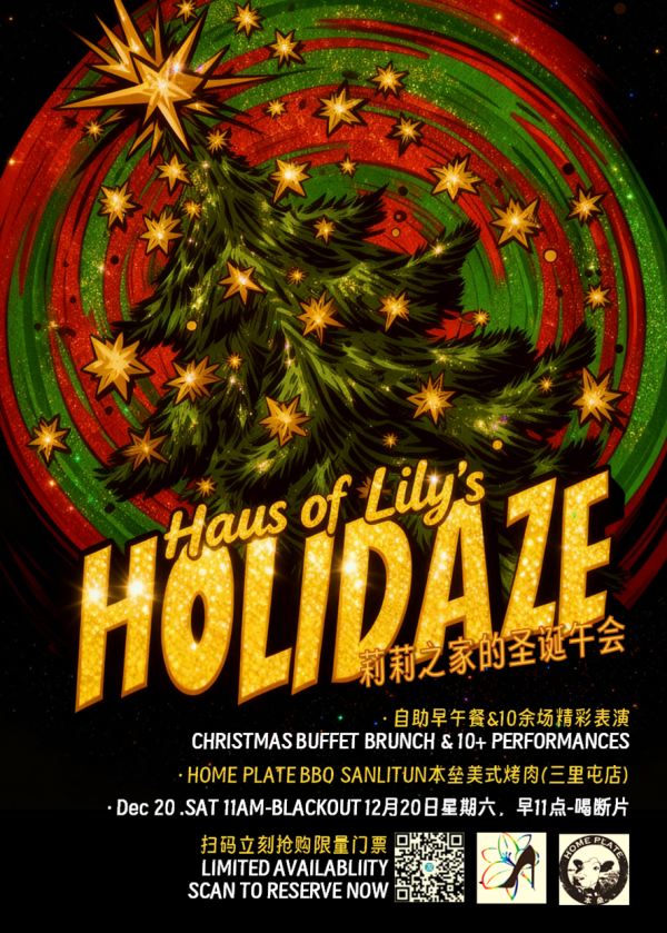 Get ready for Haus of Lily's HOLIDAZE, a festive Christmas party featuring a full buffet brunch and over 10 performances! This high-energy event at Home Plate BBQ Sanlitun is your ultimate holiday celebration. Doors open at 11 AM and the party goes until BLACKOUT. Limited availability, so scan the QR code to reserve now! (莉莉之家的圣诞狂欢会)