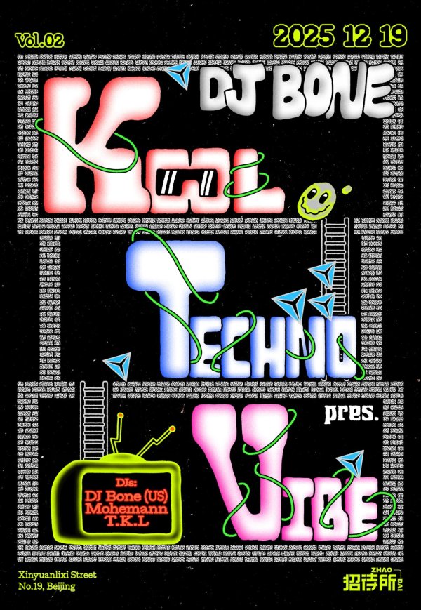Get ready for Volume 02 of Kool Techno Vibe! Detroit legend DJ Bone (US) is hitting the decks, bringing that raw, underground energy you crave. Supported by Mohenmann and T.K.L., this is a mandatory night out for Beijing's dedicated techno heads. Head down to Xinyuanlixi Street and get lost in the bass. The venue name in Chinese is 招侍所 (Zhao Shisou).