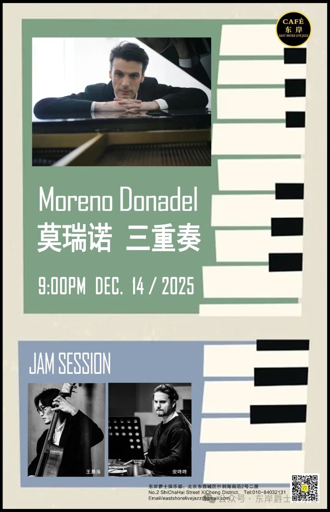 Catch the sophisticated sounds of the Moreno Donadel Trio (莫瑞诺 三重奏) at East Shore Live Jazz! The main set starts at 9:00 PM on December 14th, bringing you smooth jazz rhythms. Hang tight afterward for a late-night Jam Session featuring Wang Chenhuai (王晨淮) and Andewei (安德哇). It's the perfect cool-down for a high-energy Beijing weekend.