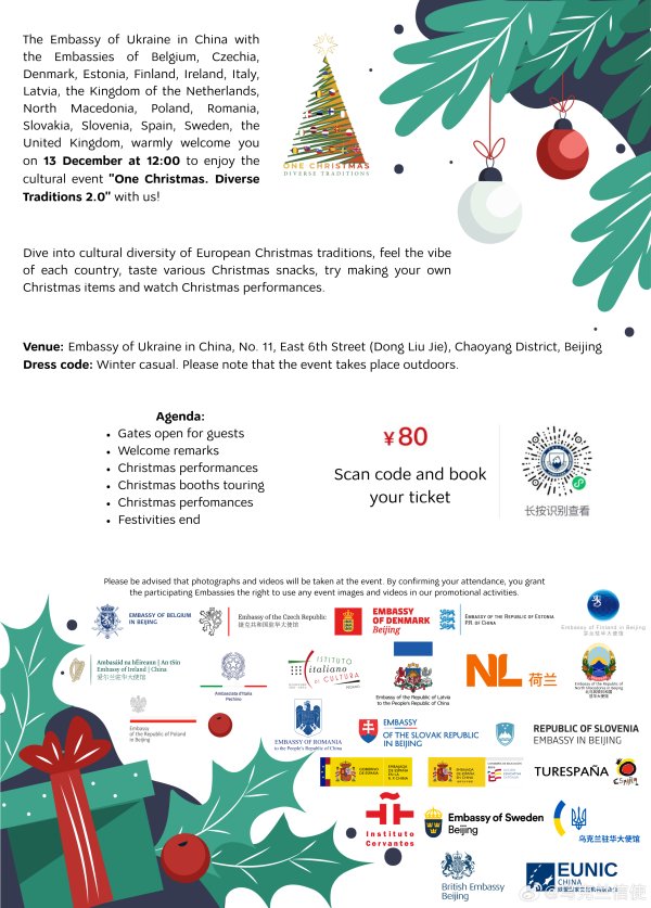 Get festive with 18 European Embassies for an afternoon of cultural celebration! Dive into diverse Christmas traditions, sample snacks, enjoy performances, and shop for unique Christmas items. Dress is winter casual. Please note the event takes place outdoors. Your ticket grants you entry to enjoy this unique gathering. Scan the QR code to book your ticket. 凭二维码购票/扫码预订。