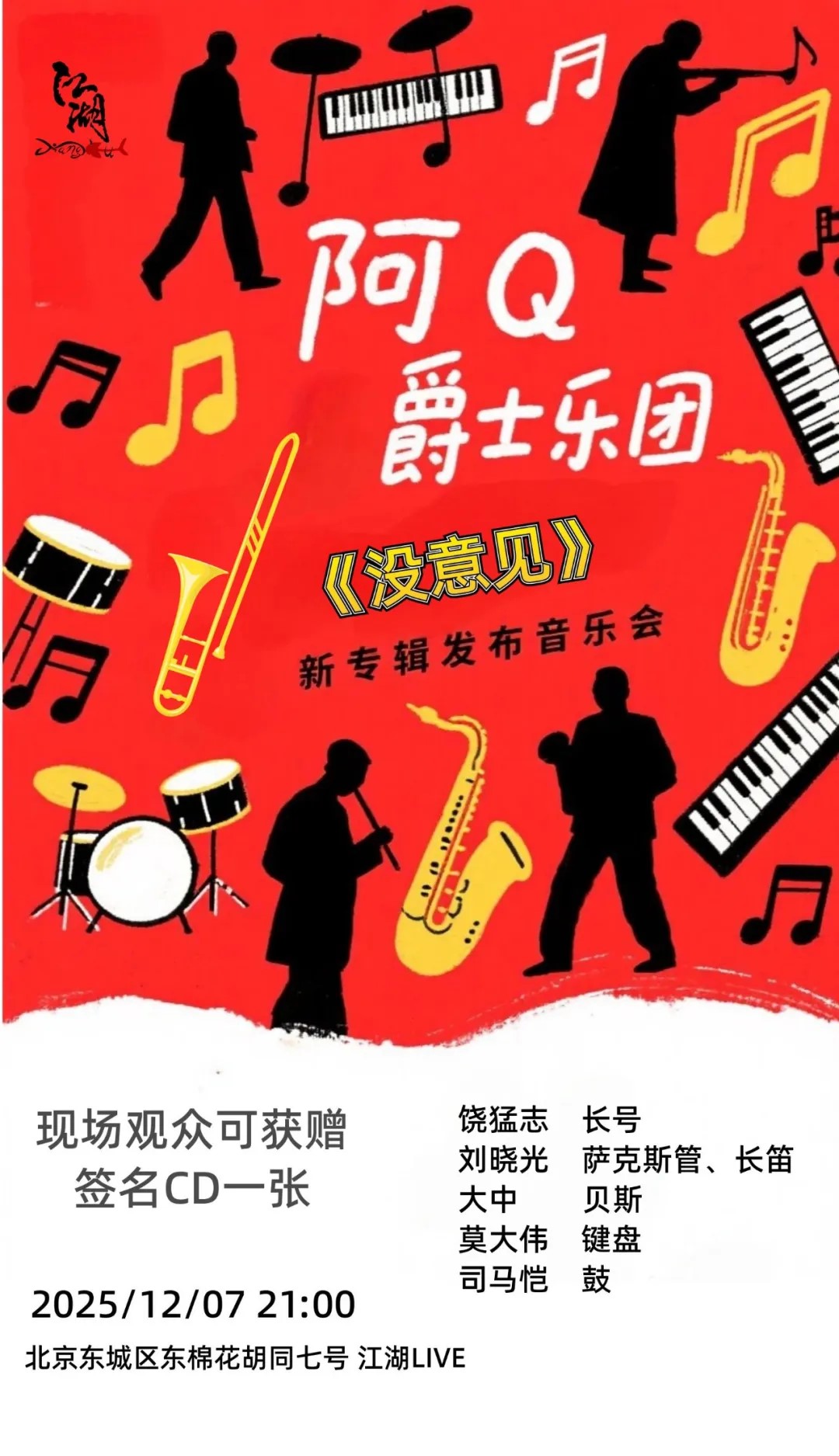 Celebrate the release of A Q Jazz Band's new album, '《没意见》' (Mei Yijian - No Opinion), at Jianghu LIVE! Featuring an all-star line-up: 饶猛志 (Trombone), 刘晚光 (Saxophone/Flute), 大中 (Bass), 莫大伟 (Keyboard), and 司马档 (Drums). All attendees will receive a signed CD! Don't miss this Sunday night show. (阿 Q 爵士乐团 《没意见》 新专辑发布音乐会)