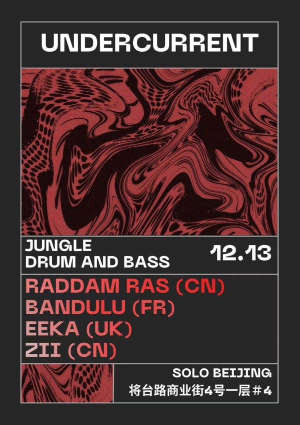 Dive into the heavy beats of Jungle and Drum and Bass at Undercurrent! This event features a lineup of four DJs: Raddam Ras (CN), Bandulu (FR), Eeka (UK), and Zii (CN). The intense red and black liquid-swirl design sets the tone for a high-energy night. The venue is located at Jiangtailu Commercial Street, Floor 1, #4 (将台路商业街4号一层#4).