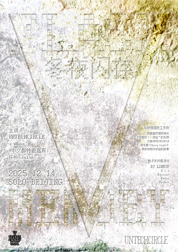 Join UNTECHCIRCLE for a unique blend of a private things history workshop (私物历史工作坊) and an electronic music party. The main speaker is UNTECHCIRCLE, with Chinese guest speaker Coelen (厌砖Coelen). The event features a DJ lineup including d.i.o., Dejoint, Bakoo, and laskoo. The workshop is about investigating related content through one short, small, or insignificant thing (探查壹件短小微不足道的()体验当下语境里私人所有权的变迁).