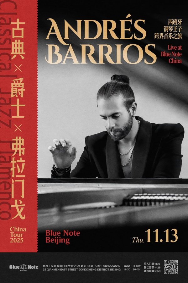 Experience a boundary-pushing concert with Spanish artist Andrés Barrios, known as the 'Spanish Prince of Crossover Music' (西班牙钢琴王子 跨界音乐之旅). His China Tour 2025 brings a unique fusion of Classical, Jazz, and Flamenco music. The show takes place at Blue Note Beijing on Thursday, November 13th. Doors open at 6:30 PM, with the show starting at 8:00 PM. General admission is 180 CNY.
