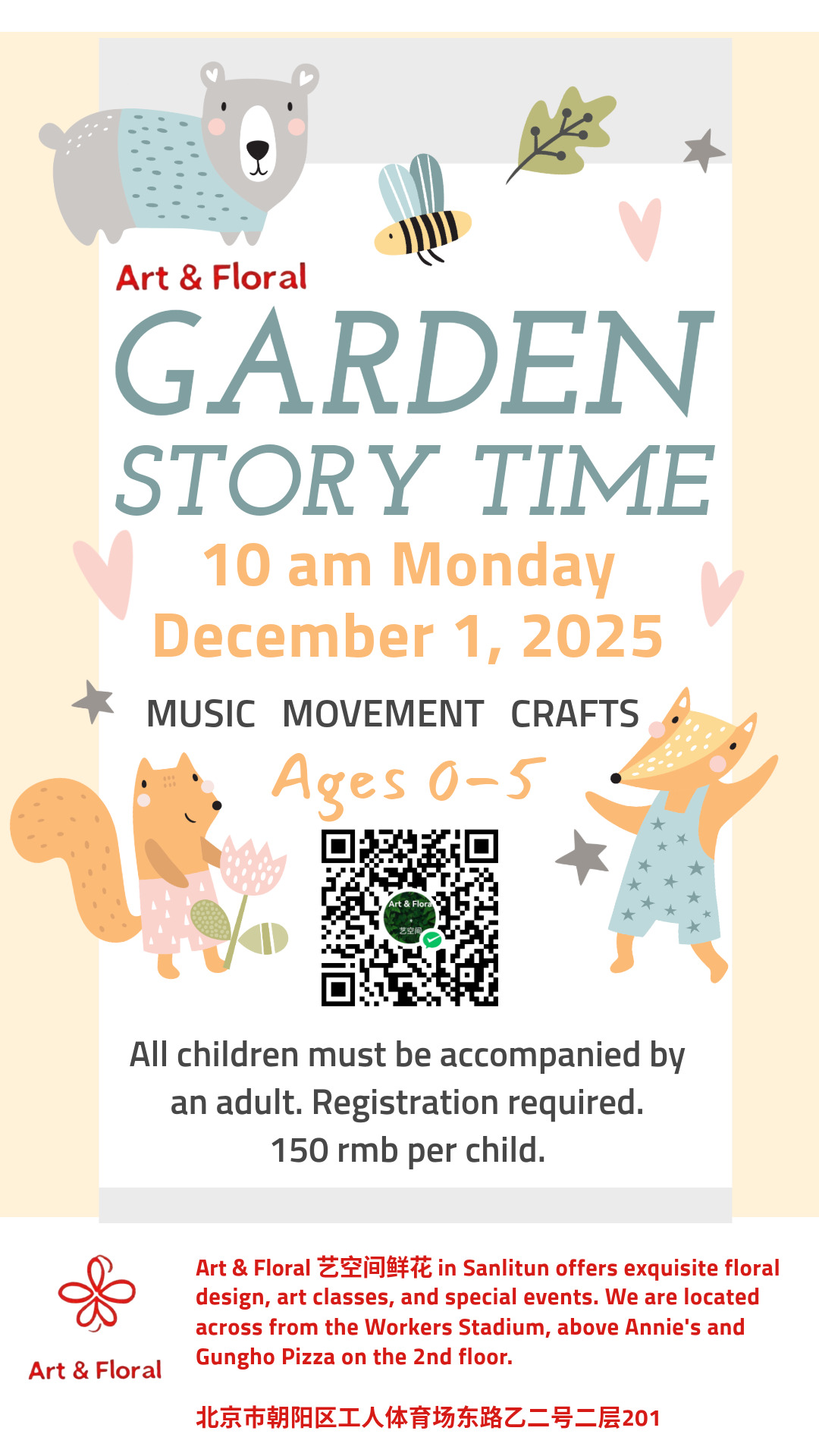 Parents and kids, head to Sanlitun for a fun morning of 'Garden Story Time' designed for children aged 0-5. Hosted by Art & Floral, the session includes music, movement, and crafts. All children must be accompanied by an adult, and registration is required via the WeChat QR code. The cost is 150 RMB per child. The venue is located across from the Workers Stadium.