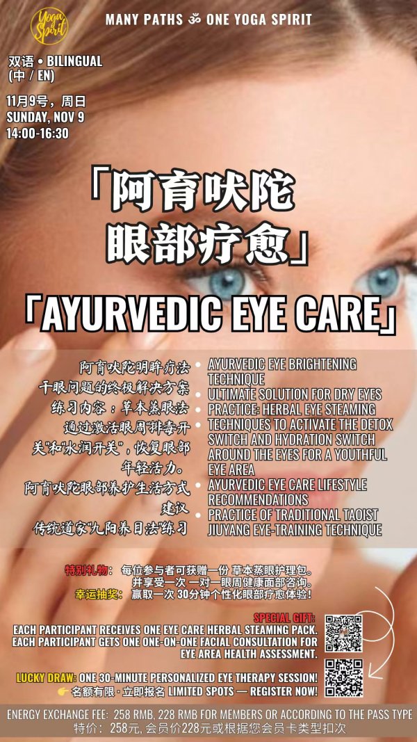 Give your eyes a break from the Beijing grind! This bilingual Ayurvedic Eye Care workshop ('阿育吠陀眼部疗愈') at Yoga Spirit is perfect for stressed-out professionals. Learn herbal steaming, Taoist eye techniques, and tips to combat dry eyes. Every participant gets an eye care pack and a consultation. It's a Sunday afternoon wellness boost for mind and body. Limited spots available!