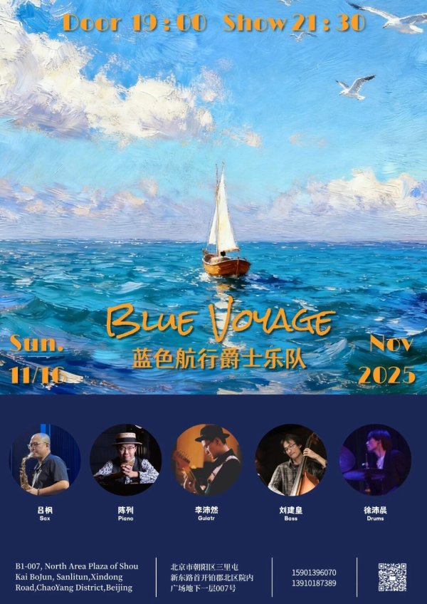 Set sail for a night of cool jazz with the Blue Voyage (蓝色航行爵士乐队) at a prime Chaoyang spot. Featuring a five-piece band on Sax, Piano, Guitar, Bass, and Drums, this is the perfect weekday escape for music lovers aged 25-35. Doors open at 7:00 PM for pre-show drinks, and the performance kicks off at 9:30 PM. Don't miss this one-night-only show!