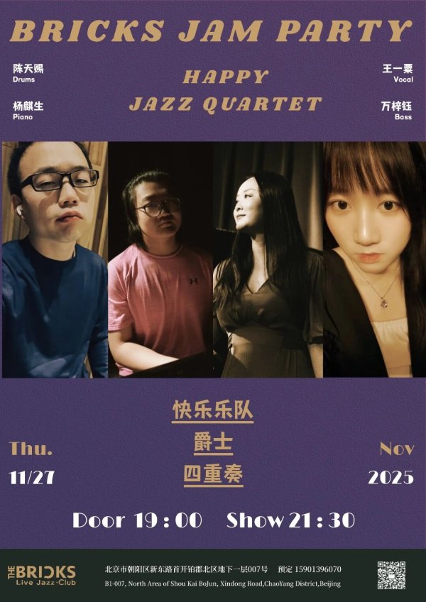 Don't miss the BRICKS Jam Party featuring the Happy Jazz Quartet this Thursday night! The talented lineup includes Chen Tianrui (Drums), Yang Qunsheng (Piano), Wang Yihao (Vocal), and Wan Qizhen (Bass), ready to deliver some great jazz tunes. Doors open at 19:00, and the show kicks off at 21:30. The event's Chinese name is 快乐乐队爵士四重奏. Check the venue contact for reservations.