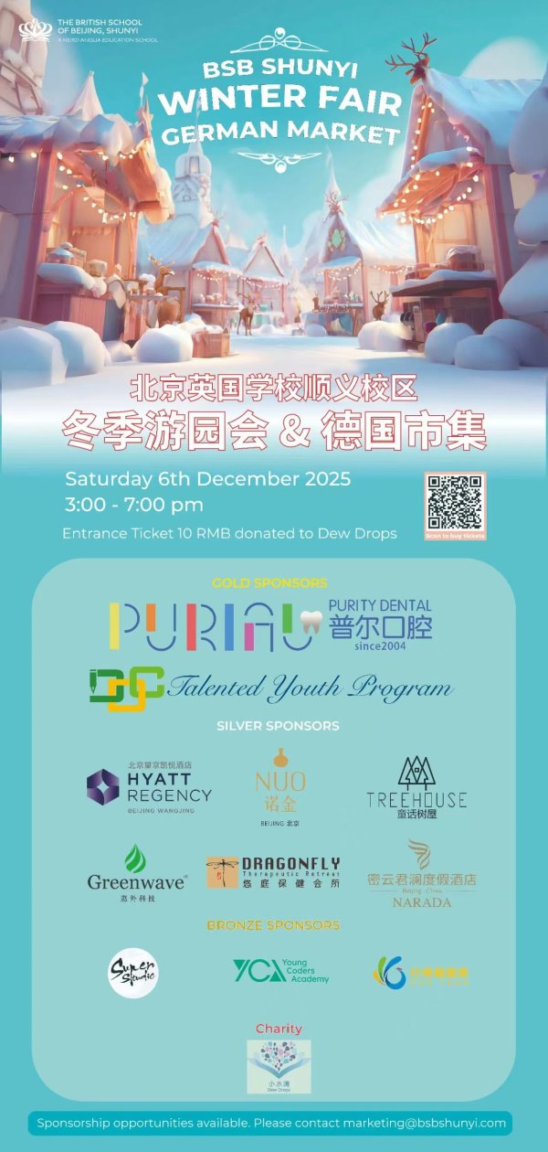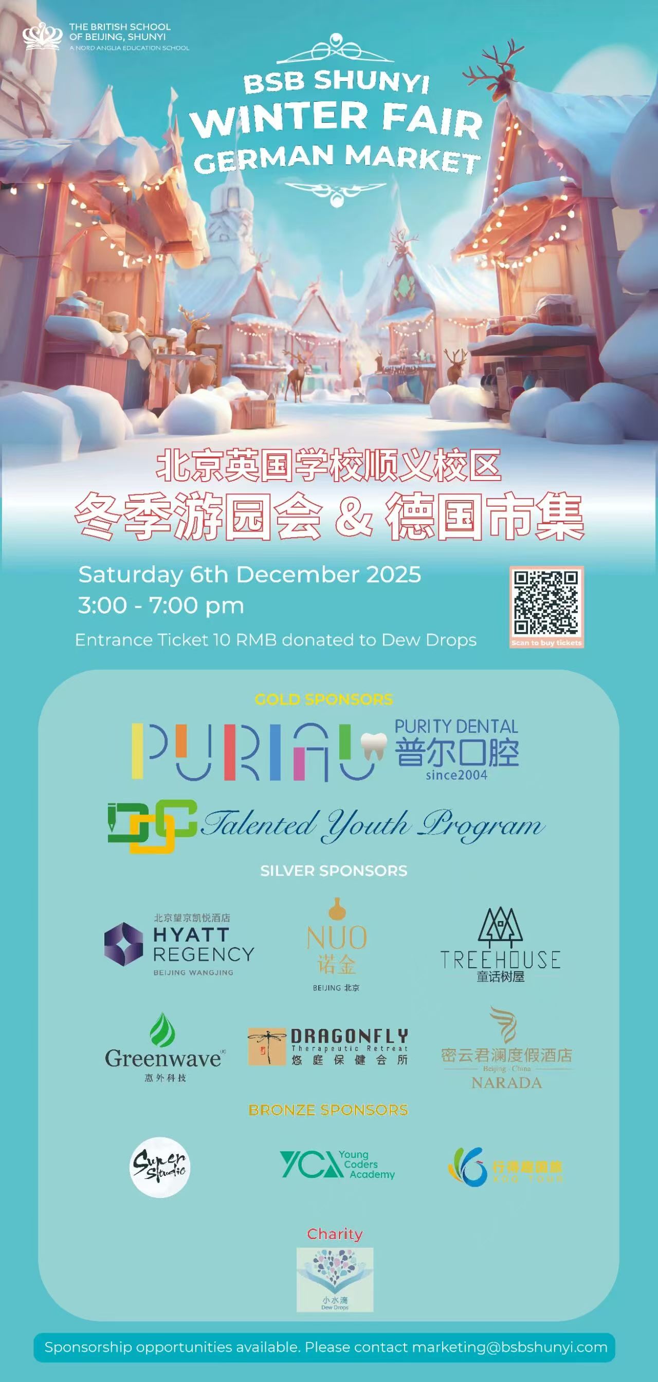 Get ready for a festive day out at the BSB Winter Fair & German Market (北京英国学校顺义校区冬日游园会 & 德国市集)! This family-friendly community event is looking for sponsors and vendors, with proceeds going to charity. Booth rental and sponsorship packages are available, making it a great networking opportunity too. Contact via email for more details.