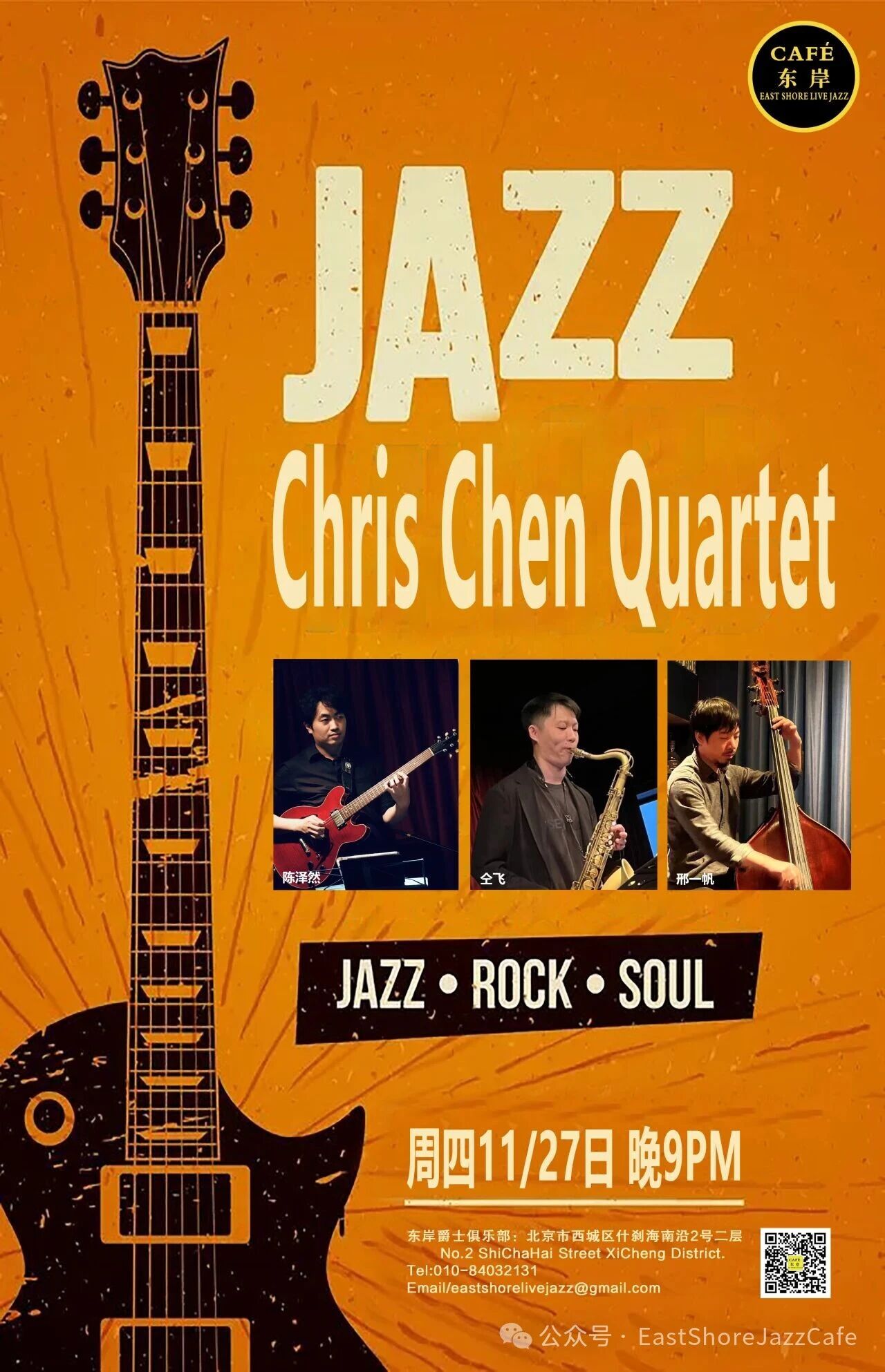 Catch the Chris Chen Quartet for a dynamic fusion of Jazz, Rock, and Soul at CAFE EAST SHORE LIVE JAZZ. The live performance starts on Thursday, November 27, at 9 PM (晚9PM). The venue is located at No.2 Shichahai Street, Xicheng District. The Chinese address is 东岸第二店, 西城区什刹海前海东沿2号二层. For more details or reservations, use the provided contact information.