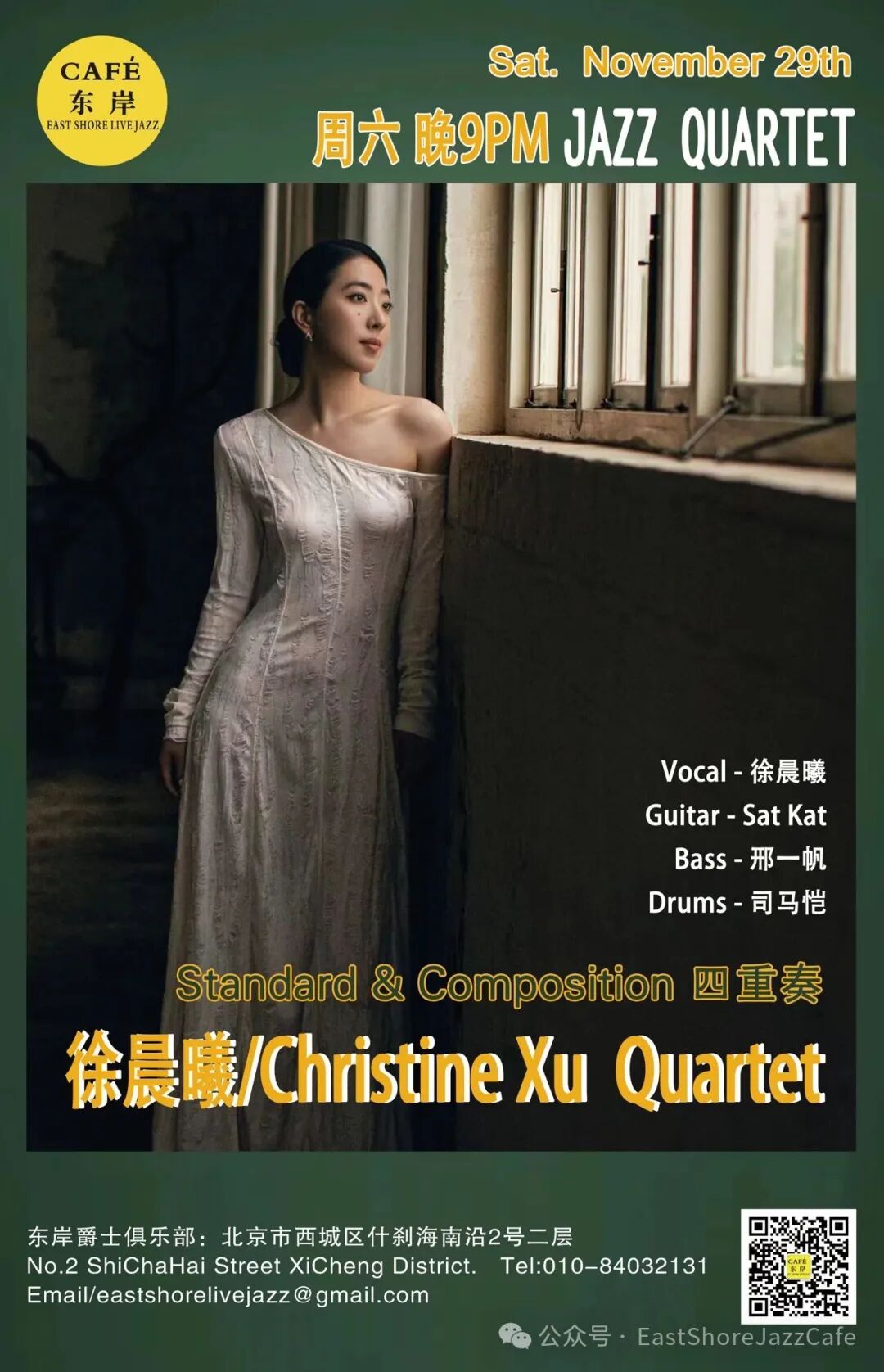 Spend your Saturday night with the sophisticated sounds of the Christine Xu Quartet at CAFE EAST SHORE LIVE JAZZ. Led by vocalist Christine Xu (徐晨曦), the band will perform a mix of Jazz Standards and original compositions. The quartet features Sat Kat on Guitar, Hao Yibo (邢一帆) on Bass, and Si Majia (司马佳) on Drums, starting at 9 PM (晚9PM).
