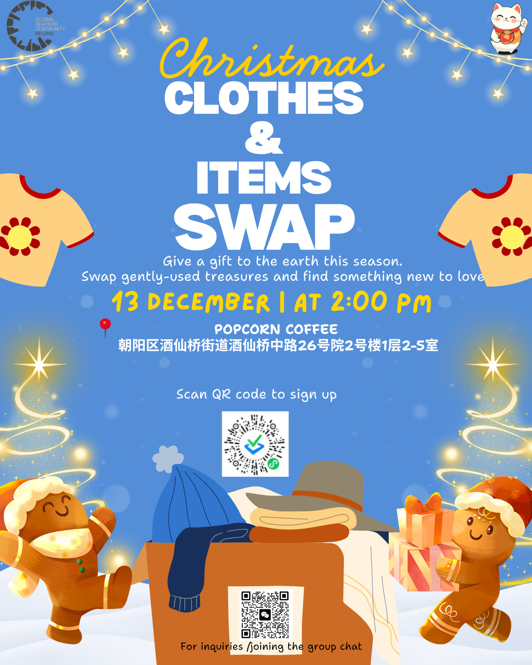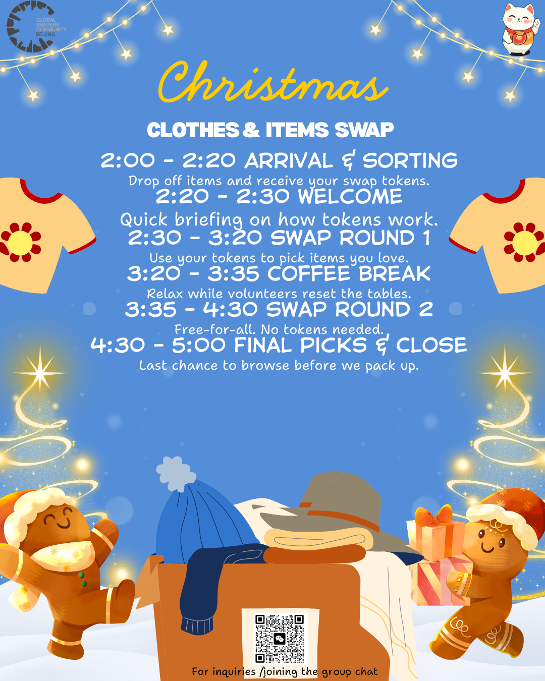 Upon arrival, items will be sorted and you’ll receive swap tokens based on what you bring. Use these during the first swap round, then enjoy a relaxed break with festive drinks and desserts . Afterwards, take part in our free-for-all second round where remaining items can be picked freely. Leftovers will be donated or saved for future swaps.