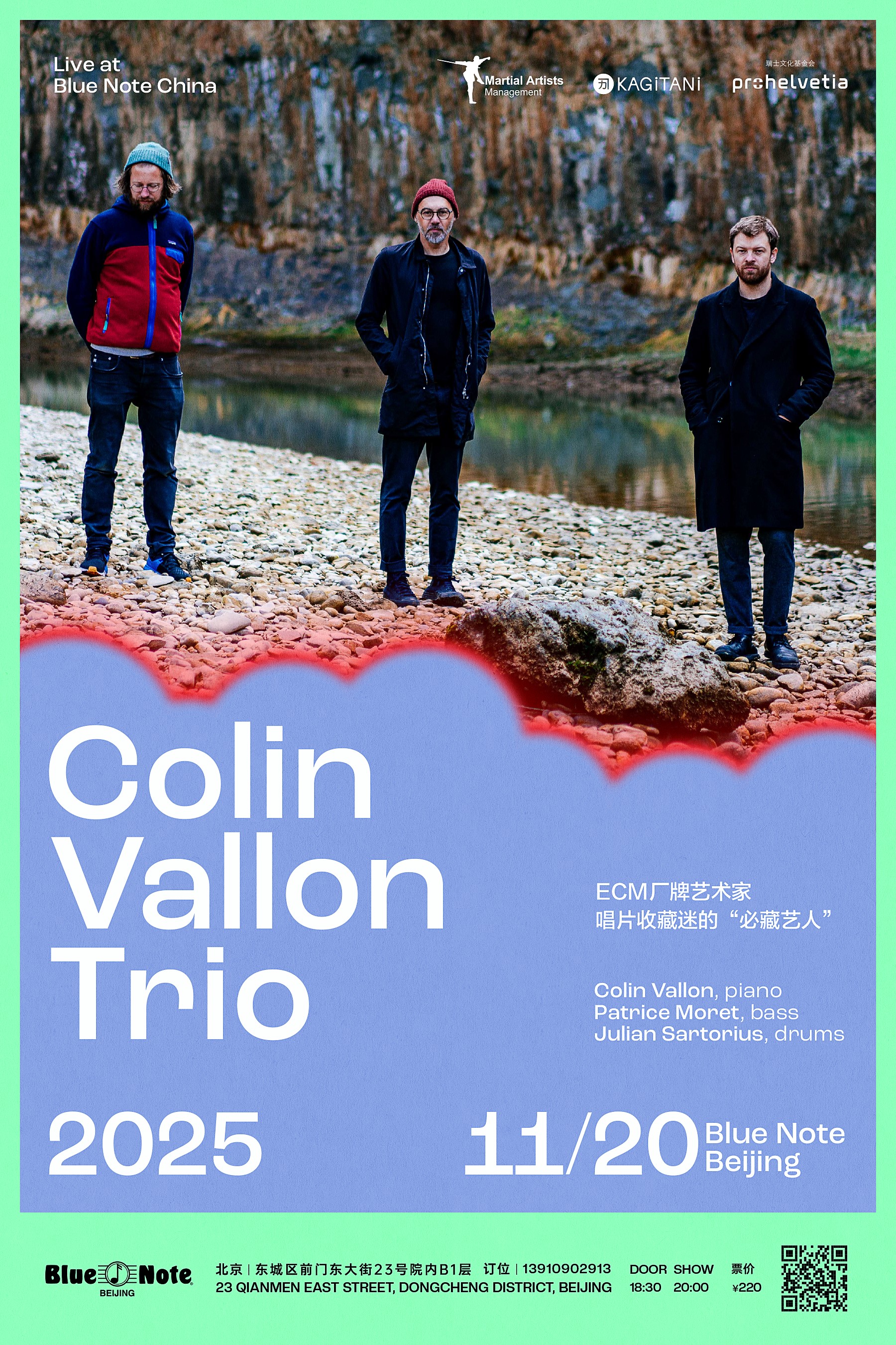 Experience the sophisticated sounds of the Colin Vallon Trio (piano, bass, and drums) live at Blue Note Beijing. Presented by Martial Artists Management, the renowned ECM artist (ECM牌艺术家) is a 'must-have for record collectors' (唱片收藏迷的'必藏艺人'). The concert is on Thursday, November 20th. Doors open at 6:30 PM, with the show starting at 8:00 PM. Tickets are 220 CNY.
