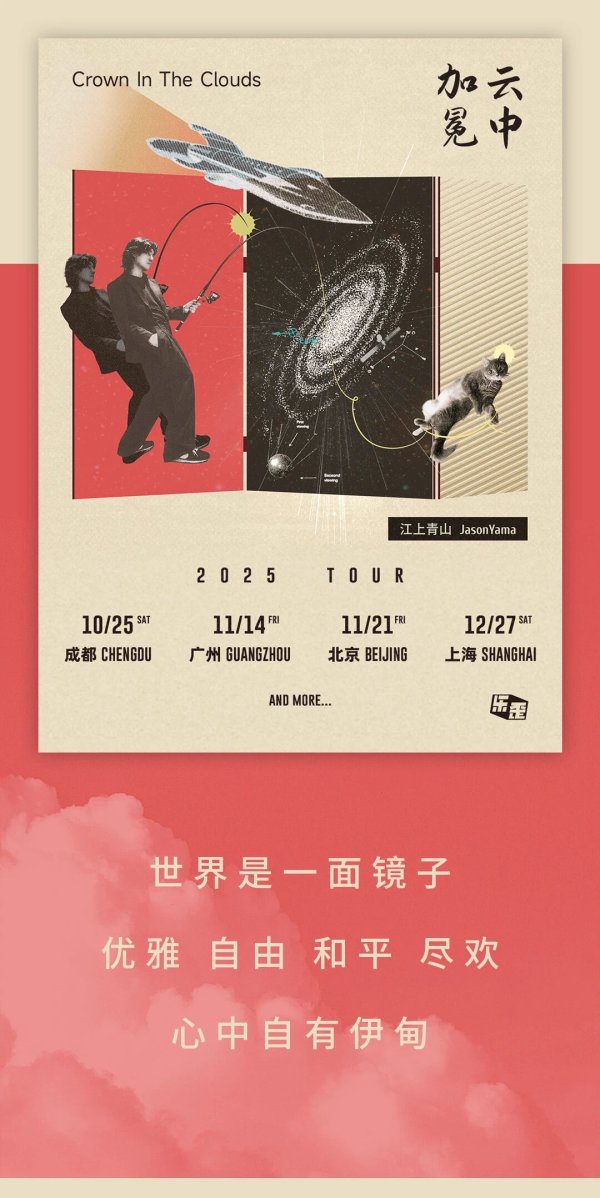 Don't miss the Beijing stop of the 'Crown In The Clouds' (加云冕中) 2025 Tour! This Friday night show features musicians Jiang Shangqing and Jason Yama. Get ready for a massive indie music performance that promises to be a wild, fun escape. The poster shares the philosophical thought: 'The world is a mirror. Enjoy elegance, freedom, peace, and harbor an idol in your heart.'