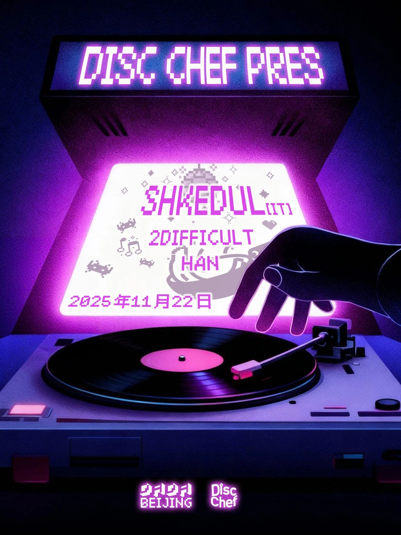 Disc Chef takes over Dada Beijing this Saturday for a high-energy night of electronic music. The line-up features SHKEDUL (ITI), 2DIFFICULT, and HAN, promising deep, pounding beats perfect for dancing. The 8-bit, neon-drenched arcade style of the poster sets the mood for a late-night party experience.