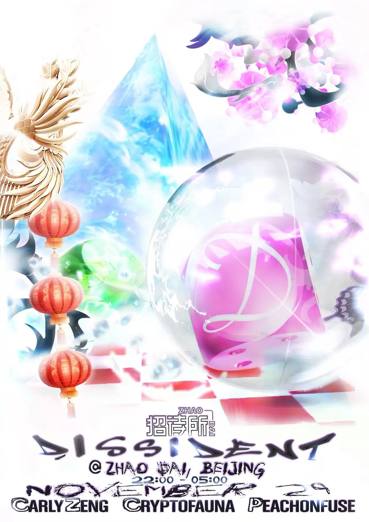 Experience DISSIDENT, a futuristic and high-energy music event hosted by ZHAO 招待 (Zhāo Dài). Featuring artists Carly Zeng, Cryptofauna, and Peachonfuse, this is guaranteed to be a genre-bending night of club sounds. The party starts late at 22:00 and runs until 05:00, perfect for the Beijing nightlife crowd looking for an immersive, visual, and auditory experience.