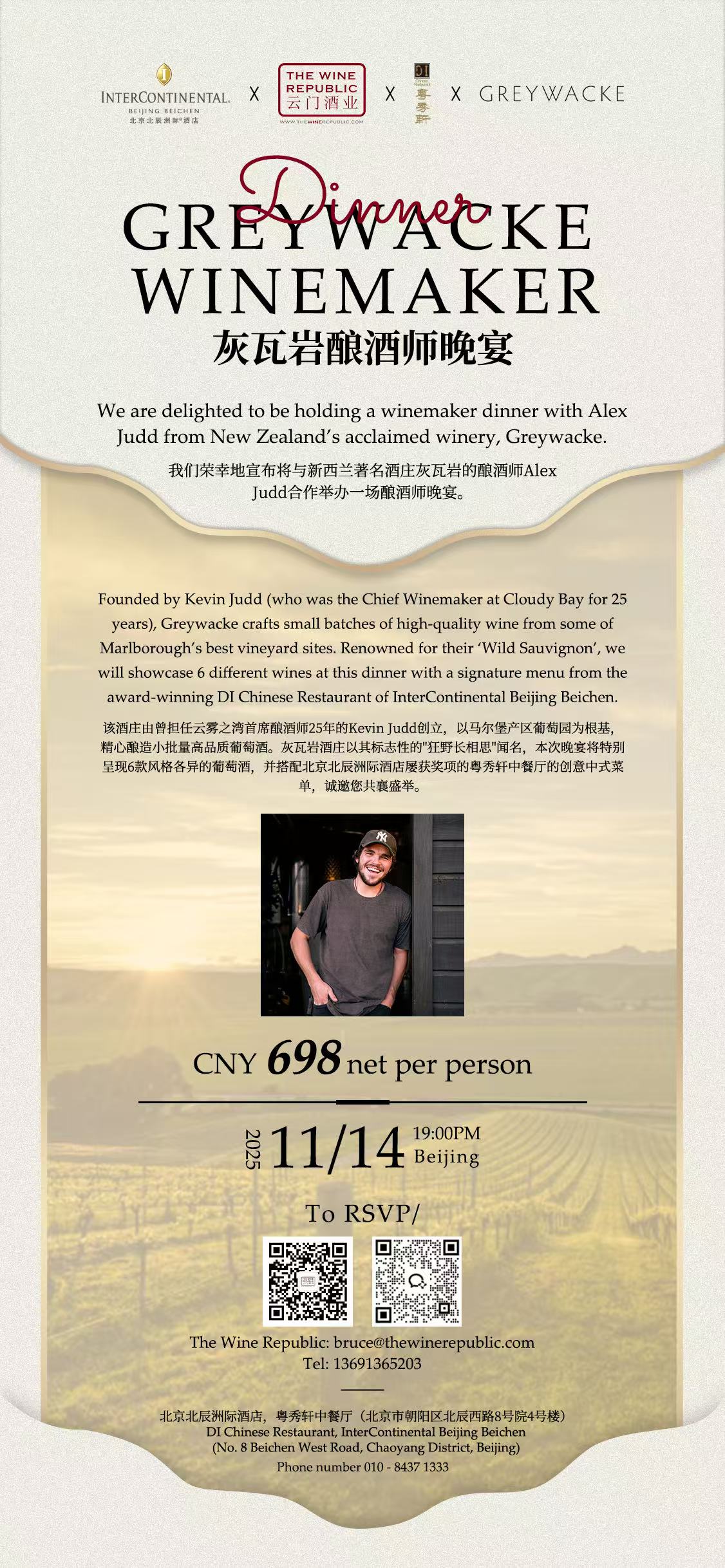 Indulge in an exclusive winemaker dinner featuring New Zealand's Greywacke and winemaker Alex Judd. Enjoy six superb wines, renowned for their 'Wild Sauvignac,' expertly paired with a signature menu at Di Chinese Restaurant, InterContinental Beijing Beichen. The Chinese title is 灰瓦岩酿酒师晚宴. To RSVP, scan the QR code on the poster.