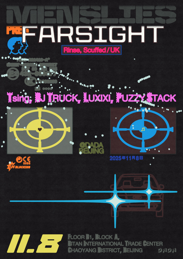Get ready for a massive night as MENSLIES presents FARSIGHT at Dada Beijing! This high-octane electronic music session features the fierce sounds of Rinee and Scuffed from the UK, supported by top Beijing selectors Ysing, MJ Truck, LUXIXI, and FUZZY/STACK. Expect heavy beats and a pure party atmosphere on November 8th. The date is 2025年11月8日.