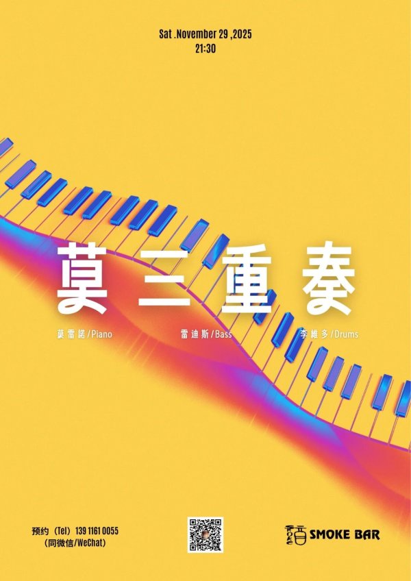 Catch a night of live jazz with the Mo San Chong Zuo (莫三重奏) Trio at SMOKE BAR this Saturday. The performance, starting at 21:30, features Mo Lu (莫露) on Piano, Lei Di Si (雷迪斯) on Bass, and Li Wei Duo (李维多) on Drums. The vibrant, warm colors of the poster hint at a cozy but energetic musical experience. Contact the provided number for reservations.
