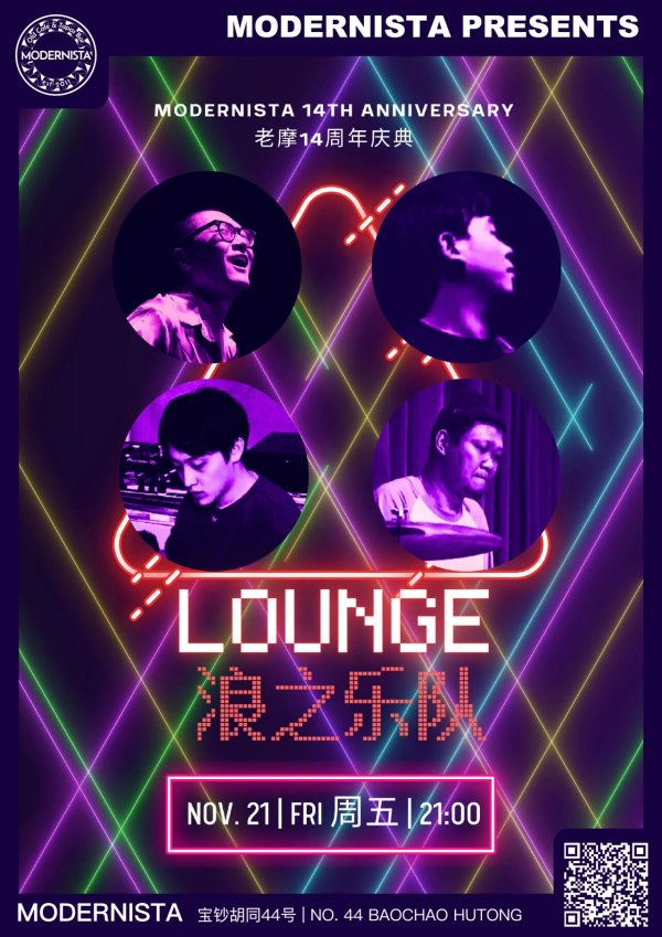 Celebrate Modernista's 14th Anniversary with a live performance by LOUNGE (浪之乐队) this Friday! Head to the iconic venue in Baochao Hutong for a night of live music and party vibes. This is part of Modernista's celebrations, promising an electrifying atmosphere for a late-night show. Check the QR code for more details.