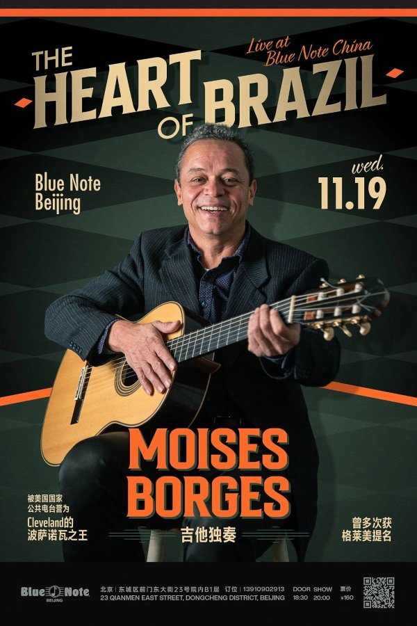 Don't miss a guitar solo performance by Moises Borges, live at Blue Note Beijing. Borges, praised by the Cleveland Public Media as the 'King of Bossa Nova' (克里夫兰的波萨诺瓦之王), will bring the 'Heart of Brazil' to the stage on Wednesday, November 19th. Doors open at 6:30 PM, with the show starting at 8:00 PM. Tickets are 160 CNY for an intimate night of Brazilian music (吉他独奏).