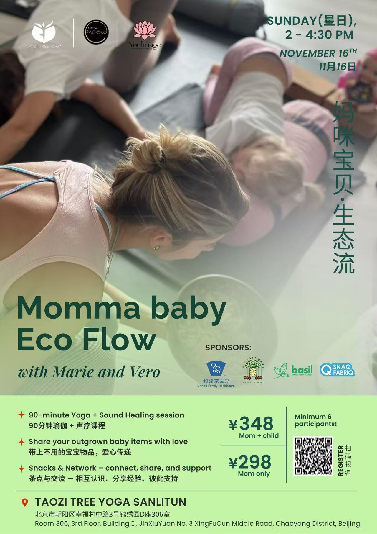 Join Marie and Vero for 'Momma Baby Eco Flow'-a 90-minute Yoga and Sound Healing session. This is a great opportunity to connect with your child and other parents while practicing yoga. You're also encouraged to bring baby items to share with others (分享您穿戴不用的宝宝物品,爱心传递). Registration is required via QR code for either Mom + Child or Mom only tickets.
