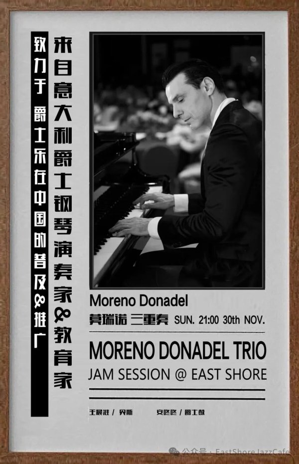 Italian Jazz pianist Moreno Donadel brings his trio for a special jam session at East Shore Live Jazz this Sunday. Donadel is an accomplished performer, composer, and educator who is dedicated to promoting Jazz in China. The trio's performance of 莫瑞诺三重奏 (Moreno San Chong Zhou) starts at 21:00. This is a must for true jazz enthusiasts!