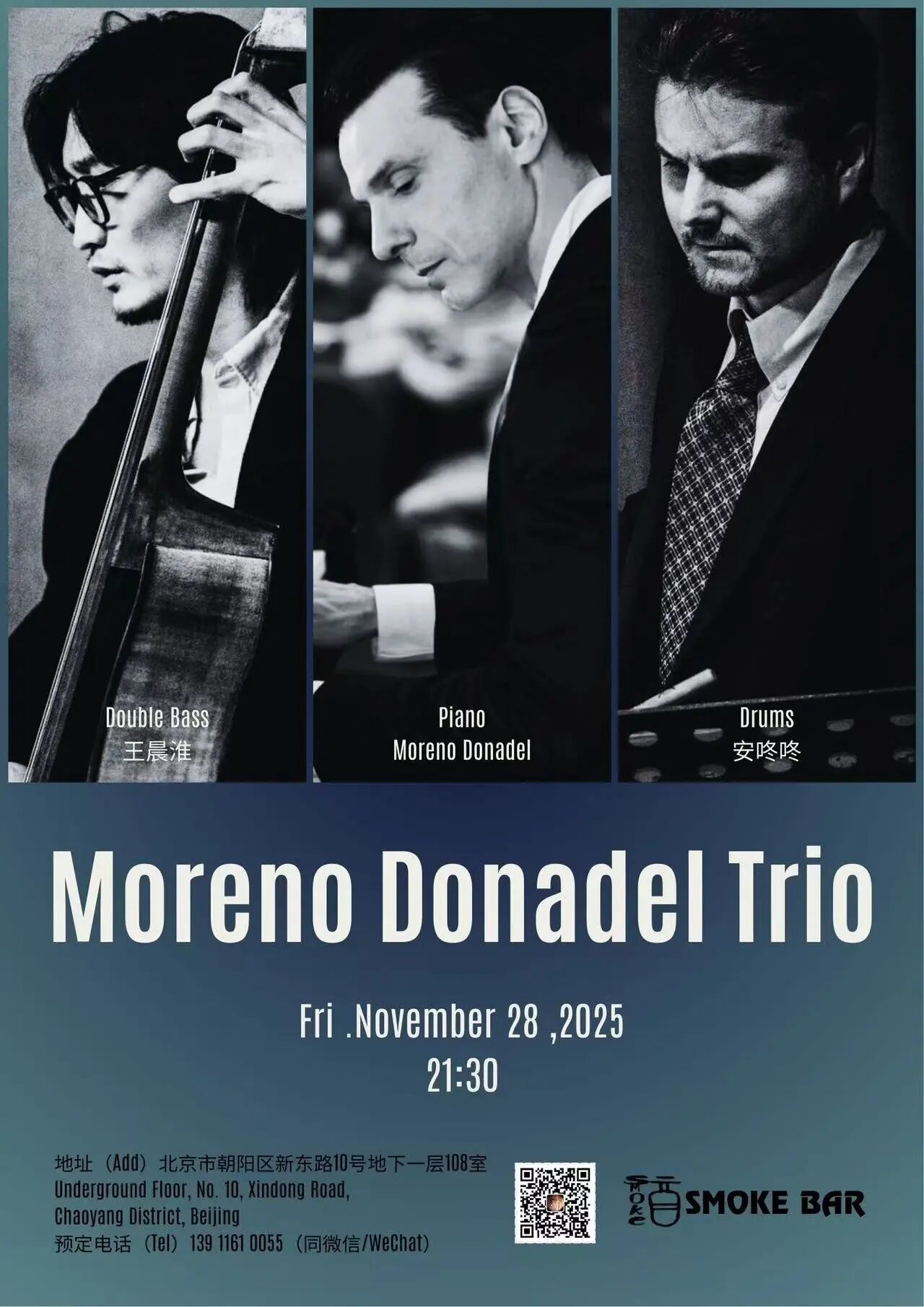 Experience an evening of sophisticated jazz with the Moreno Donadel Trio at SMOKE BAR this Friday. The trio features Moreno Donadel on Piano, Wang Junting (王君挺) on Double Bass, and An Dongyao (安咚咚) on Drums. The performance starts at 21:30. The venue is located on the Underground Floor, No. 10, Xindong Road, Chaoyang District. Reserve your table via phone/WeChat.