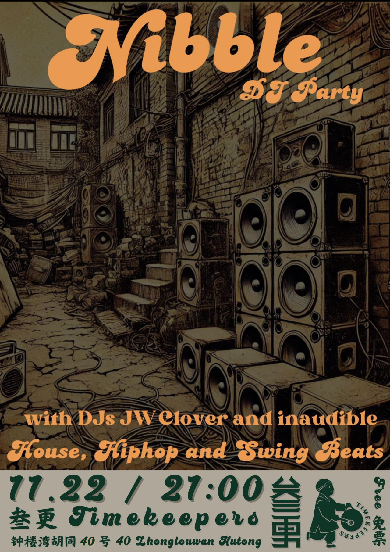Get ready to 'Nibble' on the finest House, Hiphop, and Swing Beats at Timekeepers. DJs JW Clover and inaudible are taking over the intimate Zhonglouwan Hutong (钟楼湾胡同 40 号) for a massive, free Saturday night party. Dive into the underground groove for a high-energy session.