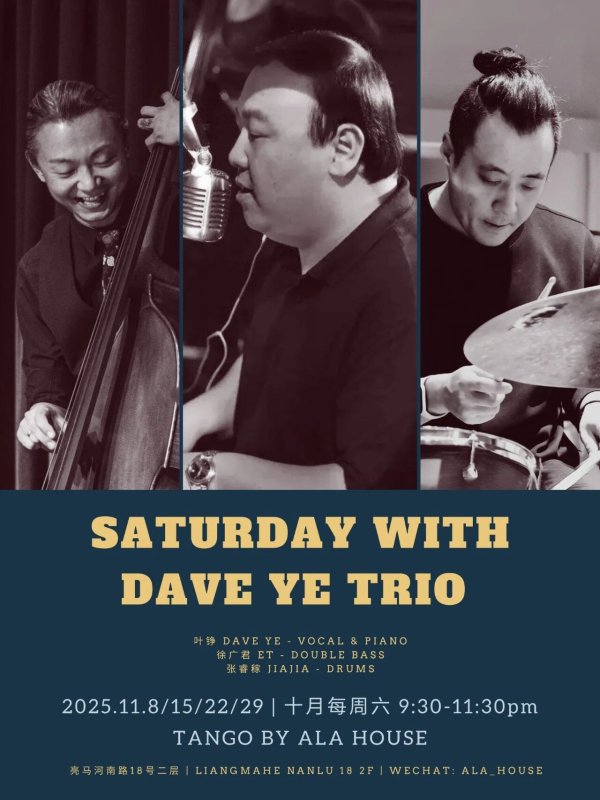 Upgrade your Saturdays with a recurring jazz residency! The Dave Ye Trio will be playing every Saturday in November (十月每周六) at Tango by ALA House. Dave Ye (叶锋) handles Vocals and Piano, E.T. (徐广君) is on Double Bass, and Jiajia (张音) is on Drums. It's a perfect blend of cool vibes and high-caliber music for a sophisticated night out.