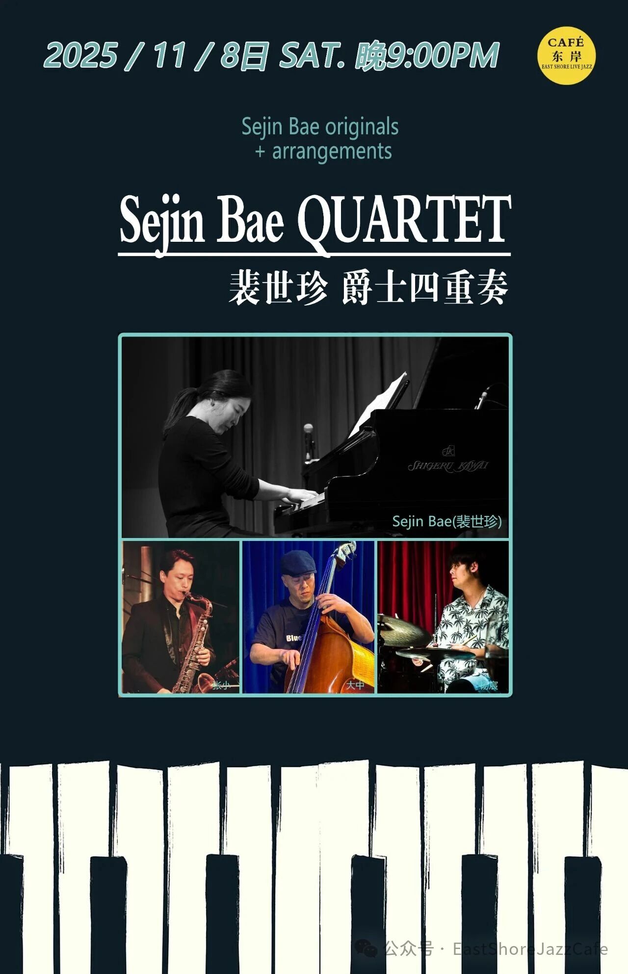 Spend your Saturday night with the Sejin Bae Quartet, featuring pianist Sejin Bae (裳世珍) for an evening of original compositions and inventive arrangements. Experience contemporary jazz perfect for Beijing's urban partygoing crowd, delivering a dose of late-night style and rhythm. Follow the WeChat account for more information and updates.