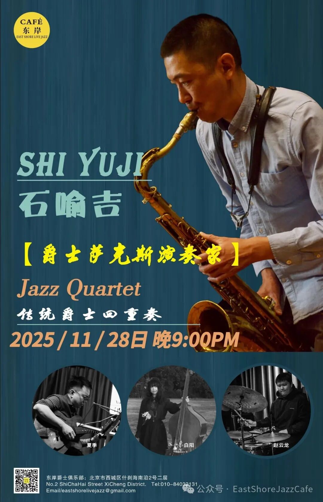 Don't miss a night of authentic Traditional Jazz at Cafe East Shore Live Jazz with the Shi Yuji Jazz Quartet. The line-up features Shi Yuji (石喻吉) on saxophone, Xia Li (夏里) on guitar, Xiao Baiyang (小白杨) on double bass, and Zhao Yunlong (赵云龙) on drums. The show starts at 9:00 PM (晚9:00PM). The event's Chinese title is 爵士萨克斯演奏 (Jazz Saxophone Performance) 传统爵士四重奏 (Traditional Jazz Quartet).
