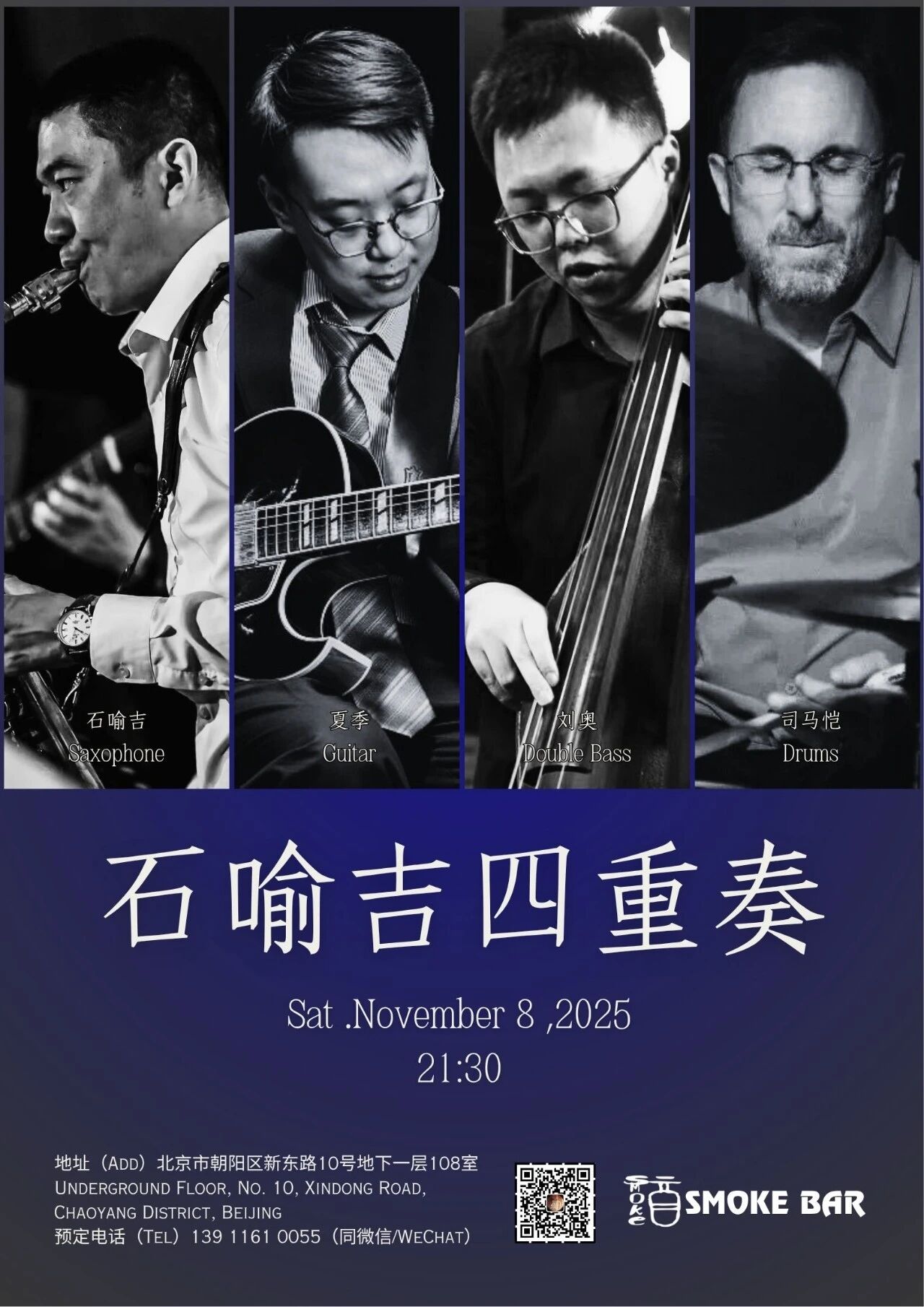 Cap off your weekend with a live jazz performance by the Shi Yuji Quartet (石喻吉四重奏) at SMOKE BAR. The band features Shi Yuji (石喻吉) on Saxophone, Xia Ji (夏季) on Guitar, Liu Ao (刘奥) on Double Bass, and Si Mawei (司马伟) on Drums. Get ready for a night of smooth improvisation and soulful sounds starting at 9:30 PM. Call or add the WeChat/phone number (Tel: 139 1161 0055) to secure your reservation.