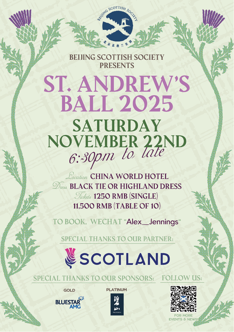 Get your tartan ready for the Beijing Scottish Society's St. Andrew's Ball 2025! This is Beijing's premier black-tie gala, promising an elegant night of dining, dancing, and community spirit. Join the sophisticated crowd at the China World Hotel. Dress code is Black Tie or Highland Dress. Special thanks to partner Scotland and sponsors BluestaR AMG and JD. The event runs from 6:30pm to late.