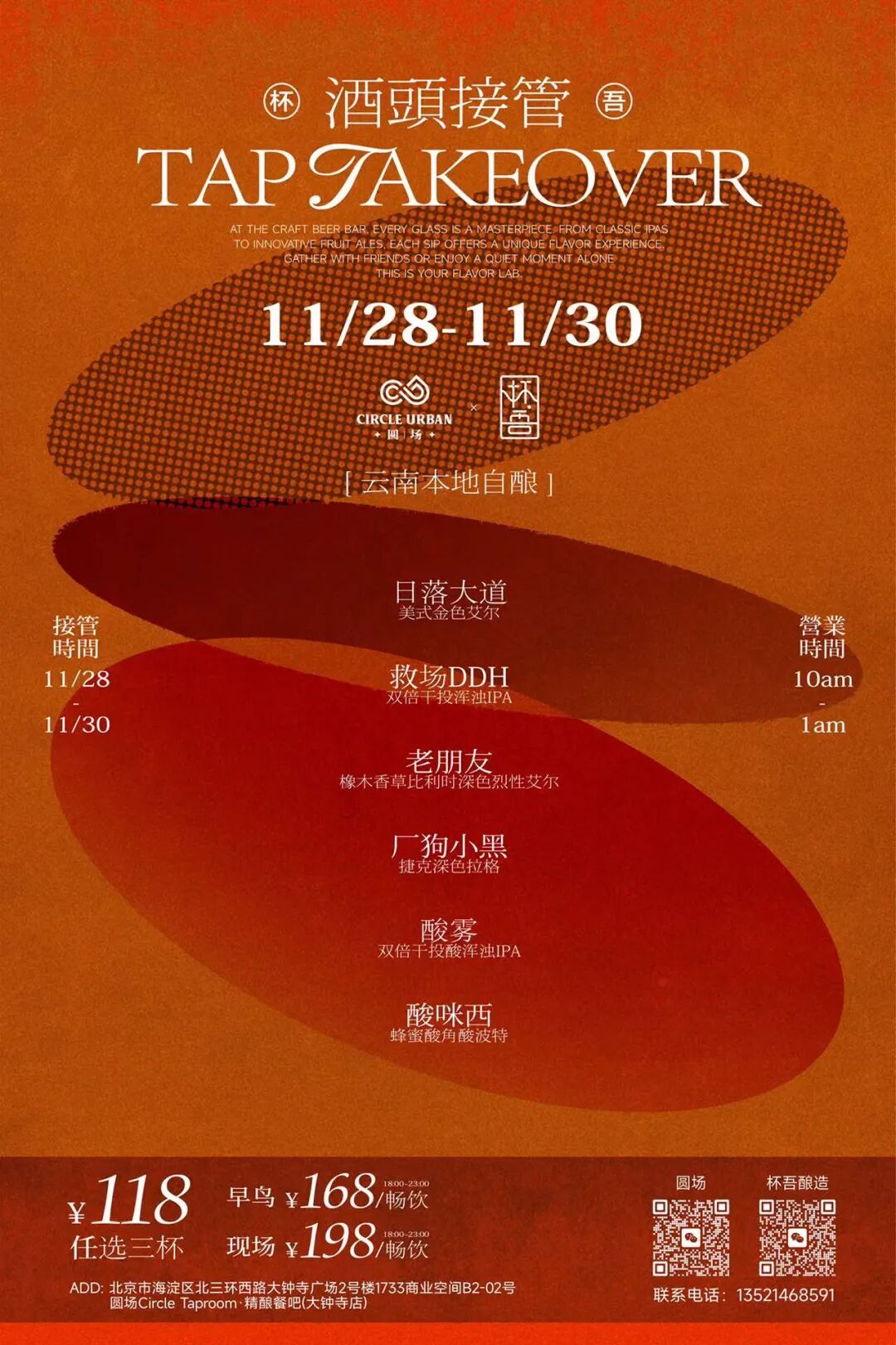 Experience an innovative 'Tap Takeover' at Circle Taproom, featuring premium local craft beers from Yunnan (云南本地自酿). Enjoy special brews like 'Sunset Boulevard' and 'Rescue DDH,' perfect for Beijing's discerning partygoers. With multiple drink package options available across three days, gather your crew for a weekend of cutting-edge flavors and great vibes.