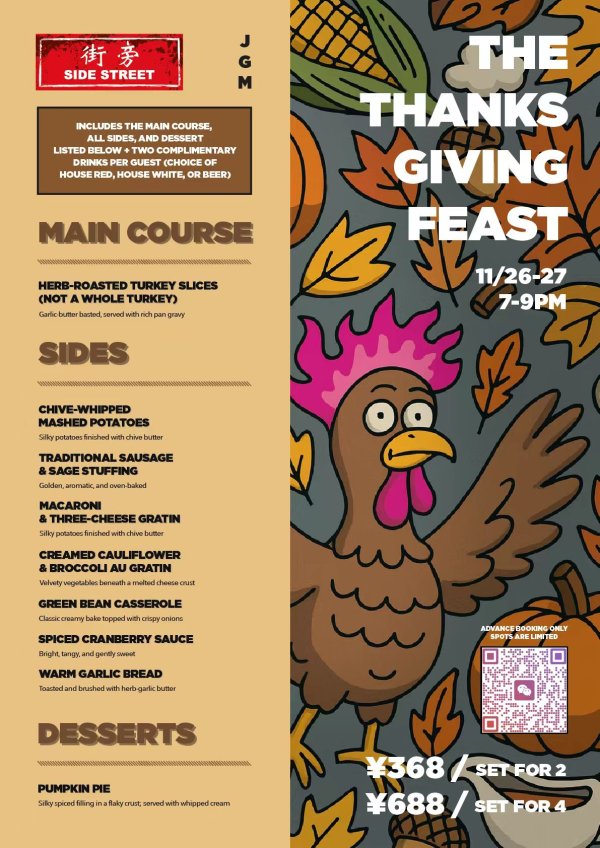 Celebrate Thanksgiving with a special feast at Side Street. The set menu includes herb-roasted turkey slices (not a whole turkey), mashed potatoes, sausage stuffing, mac & cheese gratin, creamed cauliflower, green bean casserole, spiced cranberry sauce, warm garlic bread, and pumpkin pie. Limited spots are available, so advance booking is highly recommended via the QR code.