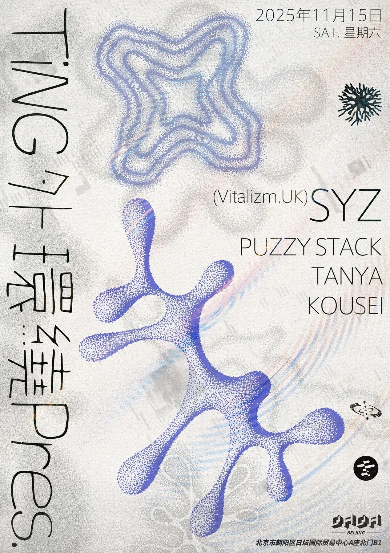 Get ready for a night of cutting-edge electronic sounds at DADA. This 'TING DRES' event features UK artist SYZ (Vitalizm.UK) alongside local talents Puzzy Stack, Tanya, and Kousei. Expect a unique atmosphere with abstract, particle-based visuals and innovative electronic music. The venue is located in the basement of the R&F Center in Chaoyang District.
