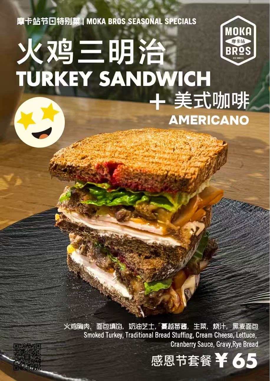 Moka Bros is offering a Thanksgiving Seasonal Special (摩卡节日特别菜) featuring a giant Turkey Sandwich and an Americano (火鸡三明治 + 美式咖啡) set! The sandwich is packed with Smoked Turkey, Traditional Bread Stuffing, Cream Cheese, Lettuce, Cranberry Sauce, and Gravy on Rye Bread. Perfect for a delicious holiday lunch or dinner. The 'Thanksgiving Set Menu' (感恩节套餐) is priced at ¥65.