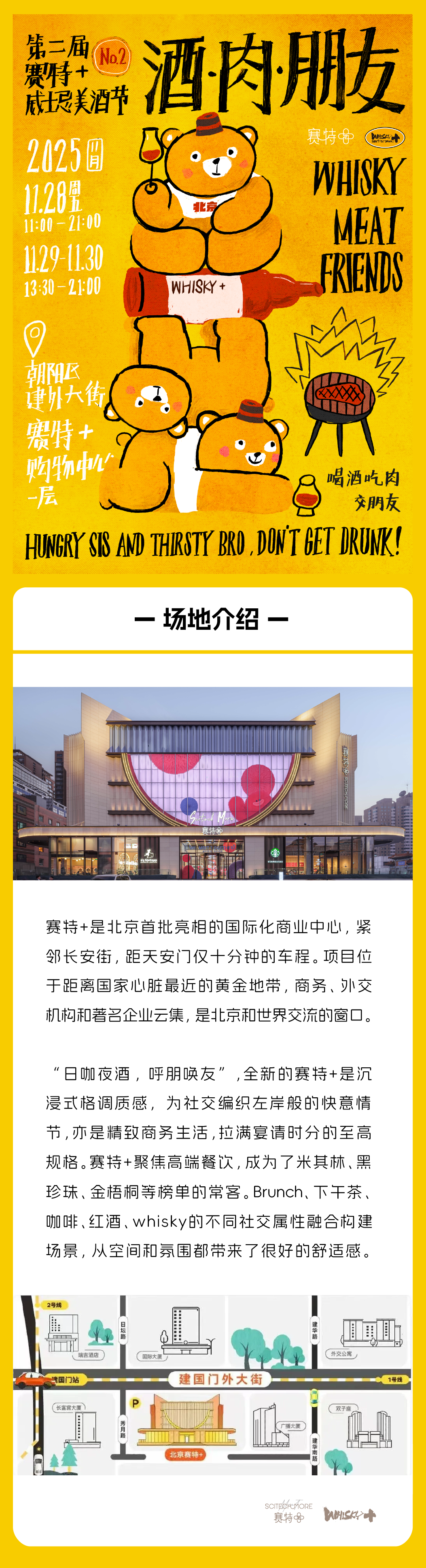 Don't miss the 2nd Annual Whisky Meet Friends Festival! The event, titled '第二届酒肉朋友' in Chinese, is a lively gathering promoting a relaxed, friend-centric social experience blending whisky, meat, and good times. The motto is 'HUNGRY SIS AND THIRSTY BRO, DON'T GET DRUNK!' Join the crowd for 'Whisky Meat Friends' at Saite+ Shopping Center (赛特+), located at one of Beijing's premier commercial centers near Chang'an Street.