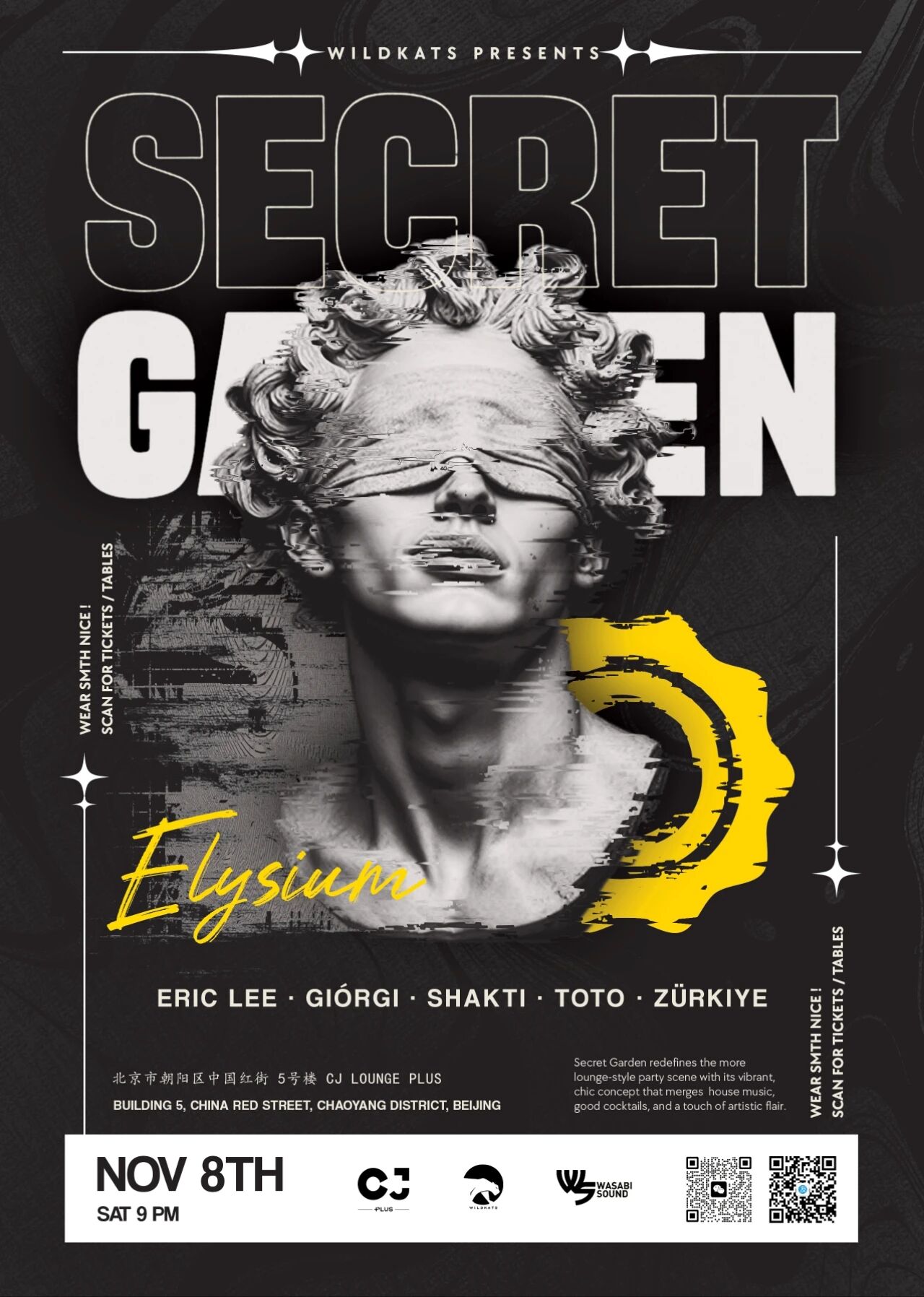 Wildkats is taking over CJ Lounge Plus for 'Secret Garden Elysium' this Saturday night. This party embodies a 'chic concept that merges house music, good cocktails, and a touch of artistic flair.' Get ready for sets from Eric Lee, Giorgi, Shakti, Toto, and Zürkiye. Wear something nice ('Wear Smith Nice!') and prepare for a massive night of partying in Chaoyang.