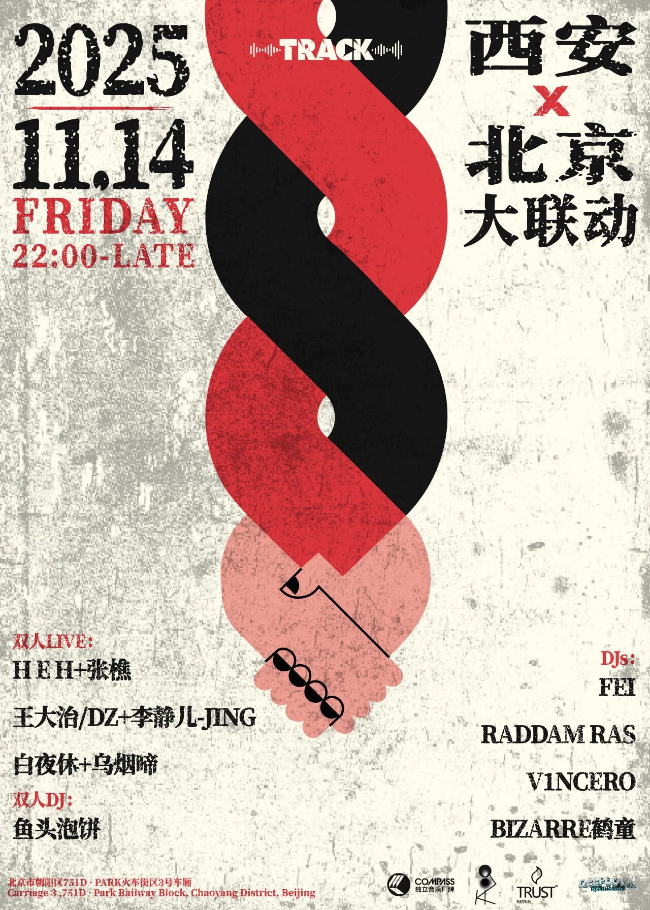 Experience an incredible night as Xi'an and Beijing's music scenes collide! TRACK hosts a special collaborative event featuring a stacked line-up of live performers and DJs, including HEH+Zhang Qi, Wang Dayu/DZ+Li Jing'er-JING, Bai Ye Xia+Wu Yanzui, Yu Tou Pao Bing, FEI, RADDAM RAS, V1NCERO, and BIZARRE Yutong. Get ready for a late night of diverse sounds and epic party vibes.