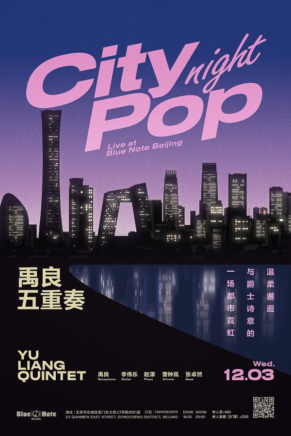 Experience an evening of 'City Night Pop' with the Yu Liang Quintet at Blue Note Beijing. The performance, titled 禹良五重奏, offers a warm, soft, and distant musical journey described as '一场都市寓言的浪漫与爵士诗歌'. The band includes Yu Liang on Vibraphone and percussion, Li Xuewei on Guitar, Zhao Shuang on Double Bass, and Zhang Ziran on Drums. The show starts Wednesday, December 3rd, at 20:00. Price is ¥160 for single entry.