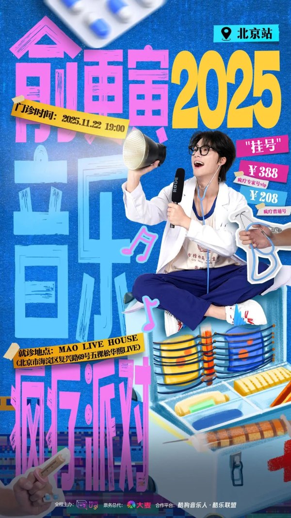 Catch Yu Miaochu's (俞苗畜) 2025 live house tour as it hits Beijing (北京站)! The concert is presented with a fun medical theme, with tickets categorized as 'Expert Registration' (挂号/医疗专家号) and 'General Registration' (医疗普通号). It's a massive gig for a Saturday night at MAO Live House. Doors open at 7:00 PM, so grab your ticket and prepare for the musical 'treatment'!