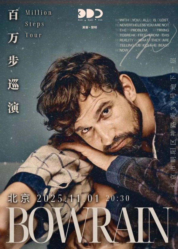 Don't miss BOWRAIN's 'Million Steps Tour' stop in Beijing! The acclaimed artist will be performing at DDC Club on Saturday, November 1st, starting at 8:30 PM. The poster, with its moody, reflective photo and existential text, hints at an intimate and contemplative musical journey. Come hear a blend of piano-driven, emotional indie sounds that defy convention.