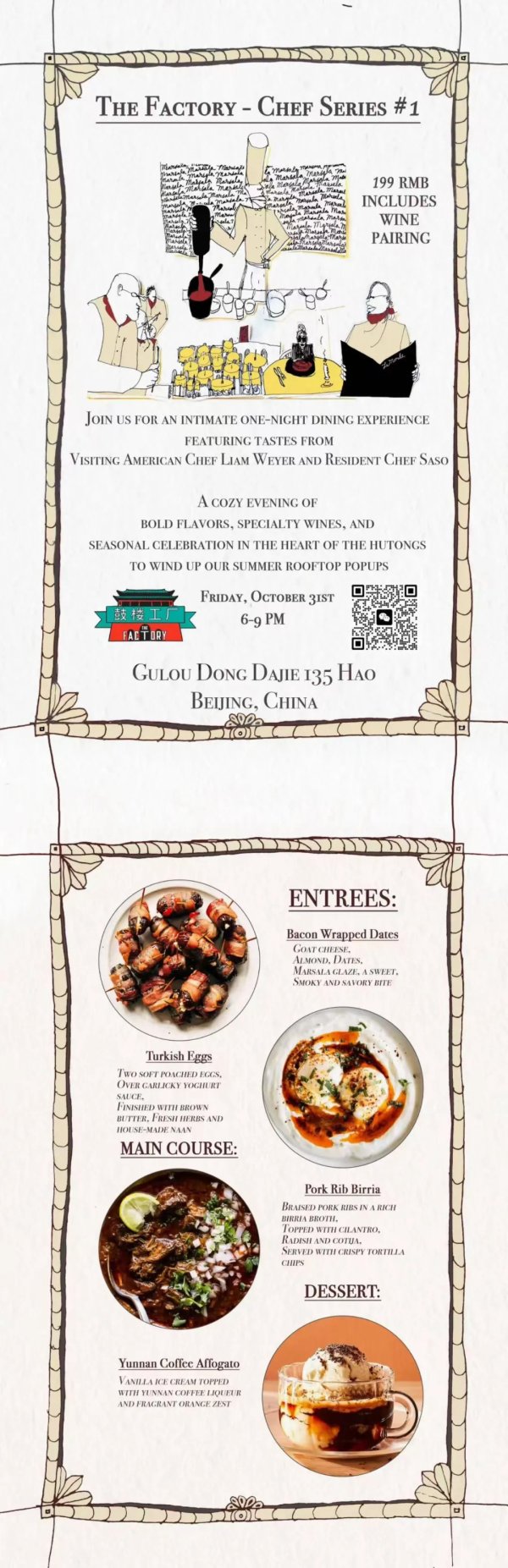 Join The Factory for the first installment of their Chef Series, an intimate one-night dinner experience featuring visiting American Chef Liam Weyer and resident Chef Saso. This is a seasonal celebration of flavors, winding up the summer rooftop pop-ups. The 199 RMB price includes a bold-flavored 3-course meal with pairing. Dishes include Bacon Wrapped Dates, Turkish Eggs, Pork Rib Birria, and Yunnan Coffee Affogato. Scan the QR code for reservations.