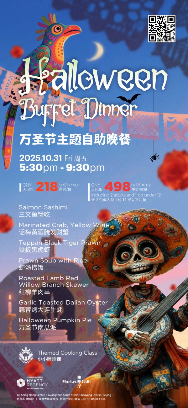 Join us for a Halloween celebration dinner buffet at Market Café on October 31! Kids can enjoy our fun-filled kids’ corner and a wide selection of delicious treats, and our Themed Cooking Class, while adults indulge in seasonal specialties: Salmon Sashimi, Marinated Crab with Yellow Wine, Teppan Black Tiger Prawn, Prawn Soup with Rice, Roasted Lamb Red Willow Branch Skewer, Garlic Roasted Dalian Oyster, and our festive Halloween Pumpkin Pie. RMB 498 per family, including 2 adults and 1 child under 12, or RMB 218 per person. Everyone can embrace the Halloween spirit here!