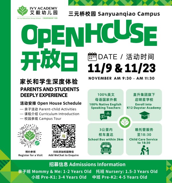 Parents looking for early childhood education for their kids (1-5 years old) should check out the IVY Academy Open House! This 'Parents and Students Deeply Experience' (家长和学生深度体验) event includes parent-child activities (亲子活动), a curriculum introduction (课程介绍), and a campus tour (校园参观). The school offers 100% Native English Speaking Teachers and enrollment pathways to Daystar Academy (直升集团旗下启明星学校). Free registration is required.
