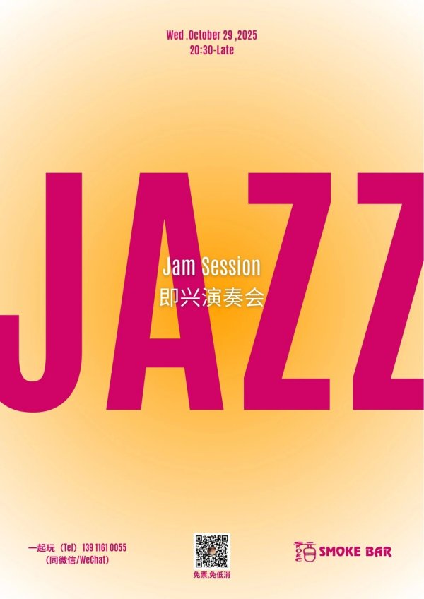 Midweek blues? Not in Beijing! Head to SMOKE BAR for a soulful JAZZ Jam Session this Wednesday. Starting at 8:30 PM, this '即兴演奏会' is your chance to catch some spontaneous, high-energy live music. The best part? Entry is free! Get ready to groove 'til late with the cool crowd.